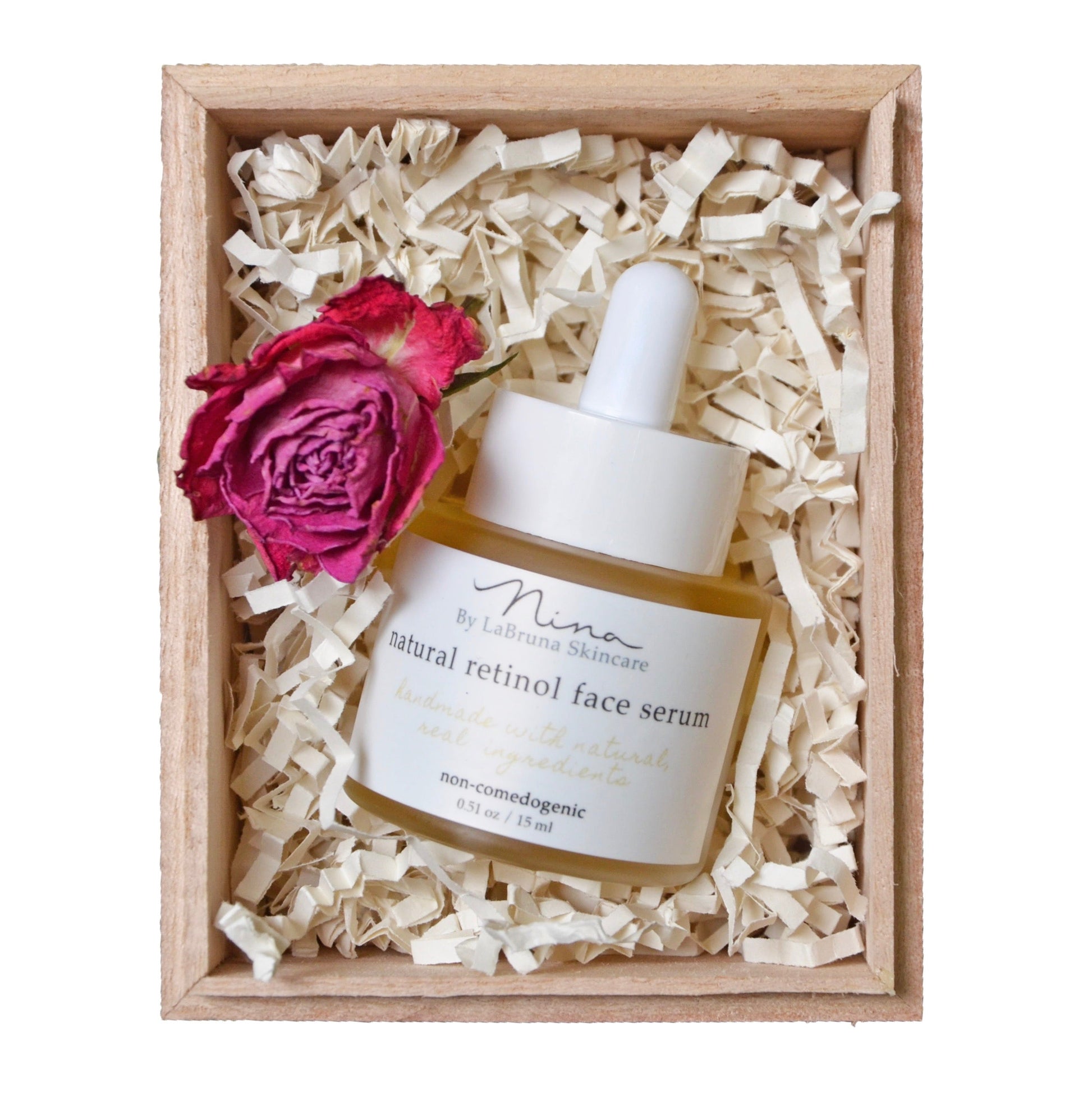 Nina’s Natural Retinol Face Serum is a plant-derived alternative to retinol. It contains Bakuchoil (1%) and is packed with plant seed oils rich in beta carotenes. Our serum may help to reduce fine lines and the signs of aging. Enhanced with Vitamins C, D, E and K from Blueberry, Blackberry, Olea Europaea, Grape and Prickly Pear, this face serum is a powerhouse, which can restore your skin’s natural glow. Unlike chemical retinol, Nina’s formulation can be used during the day. 15 ml.