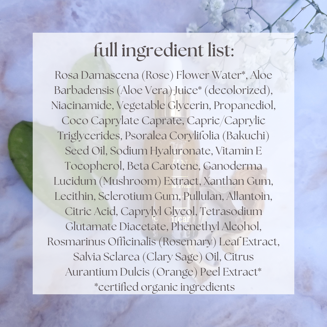 Bakuchiol is nature’s retinol - known to encourage cell turnover, which, together with Mushroom Peptides, helps support natural collagen production and maintain skin elasticity. Hyaluronic Acid and Niacinamide work together to hydrate and soothe skin, while Vitamin E and Beta Carotene help reverse the appearance of damage from environmental stressors.