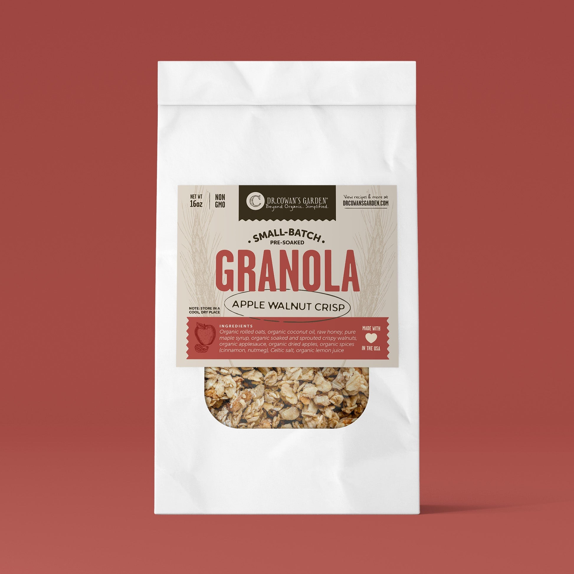 Ingredients: Organic rolled oats, organic coconut oil, raw honey, pure maple syrup, organic soaked and sprouted crispy walnuts, organic applesauce, organic dried apples, organic spices (cinnamon, nutmeg), Celtic salt, organic lemon juice. Nothing else. Contains: Tree Nuts (walnuts) and Coconut