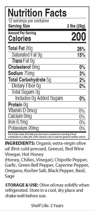Organic extra-virgin olive oil (first cold-pressed, Greece), red wine vinegar, hot honey (honey, chilies, vinegar), chipotle pepper, garlic, green bell pepper, cayenne pepper, oregano, kosher salt, black pepper, basil, sage.